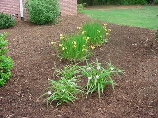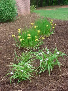 Louisiana Irises are still blooming...with the Spiderwort (Tradescantia Osprey) behind them.